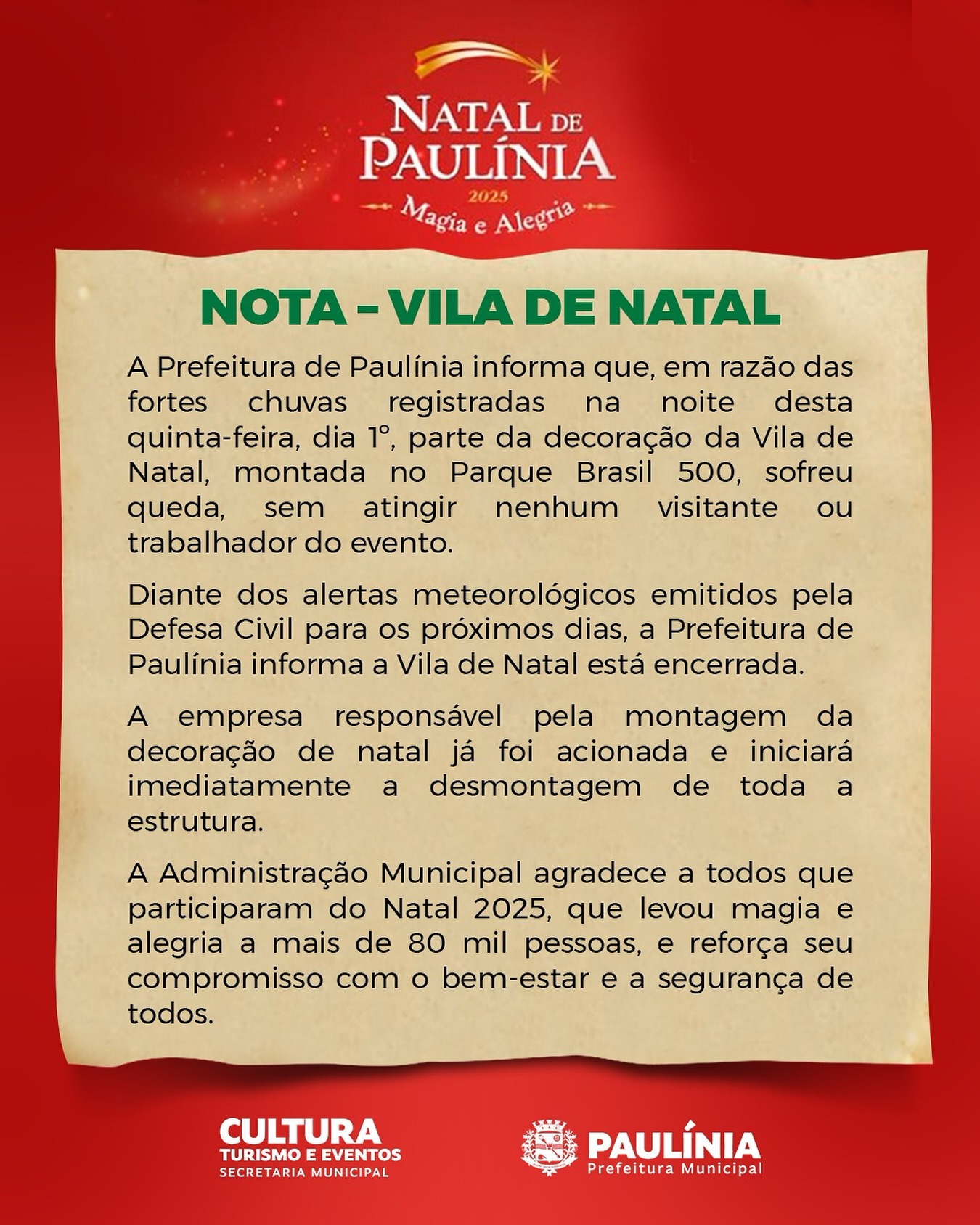 A Prefeitura de Paulínia divulgou nota oficial informando que acompanha os danos causados pela tempestade e avalia a situação da decoração natalina, além de reforçar que a prioridade é garantir a segurança da população. Equipes municipais foram mobilizadas para retirar estruturas danificadas e prevenir novos riscos em áreas públicas.